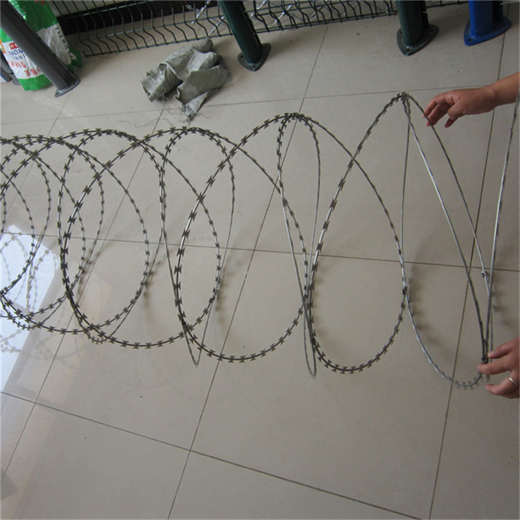 螺旋單一型刀片刺繩是由一根蛇腹型刀片刺繩環(huán)繞而成,不需要使用卡子來(lái)固定,按照其展開(kāi)的自然形式進(jìn)行安裝。刀片刺繩布置的一種,它沿墻壁或柵欄自然環(huán)繞來(lái)達(dá)到防護(hù)目的。選用優(yōu)質(zhì)低碳鋼絲, 鍍鋅、涂塑、噴塑。特點(diǎn)是網(wǎng)身剛硬,不必用張力絲、不需要高技術(shù)工人維護(hù)、易安裝、維護(hù)成本低。
