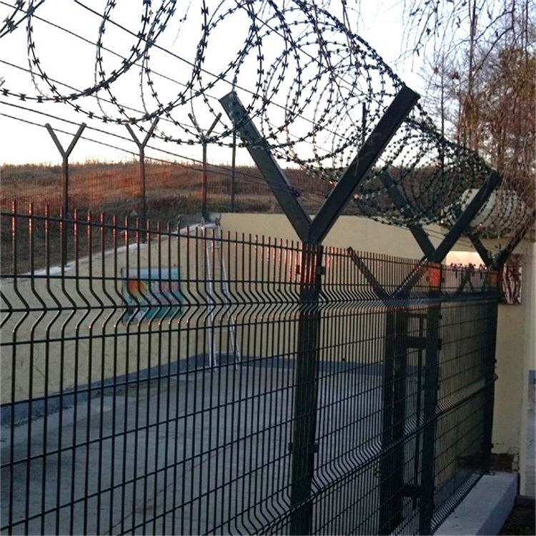 10、金屬網(wǎng)墻的頂部應(yīng)設(shè)一道蛇腹型刀刺網(wǎng),蛇腹型刀刺網(wǎng)材質(zhì)宜為304 不銹鋼,圈徑宜為 600mm,每米長度不應(yīng)少于 7 圈,圈距排列應(yīng)均勻,刀片形式宜為 BTO-22(芯線直徑 2.5mm±0.1mm,刀片厚 0.5mm±0.05mm,刀片長 22mm±1mm,刀片寬度 15mm±1mm,刀片間距 36mm±1mm),用于支撐刀刺網(wǎng)的支架伸出刀刺網(wǎng)長度不應(yīng)大于 50)mm;