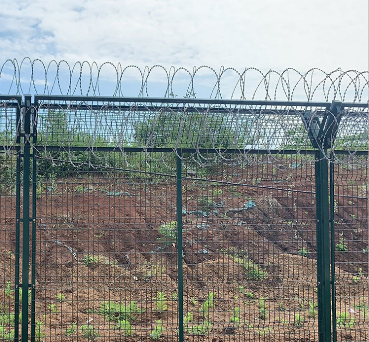 機(jī)場隔離網(wǎng)的安裝要求護(hù)欄網(wǎng)的整體安裝高度要3米以上,網(wǎng)片與網(wǎng)片間隙不能大于10公分,立柱與網(wǎng)片連接離地部分不能大于5公分,立柱垂直高度為3.5米,每套安裝整齊劃一,機(jī)場隔離網(wǎng)上部分采用60直徑的熱鍍鋅刀片刺繩,刺繩的刀片與刀片間隔為20cm。正常的情況下每米出1.2kg左右的刺繩。安裝的同時采用卡扣卡在V型網(wǎng)上面。這樣有利于熱鍍鋅刀片刺繩的穩(wěn)固性能。