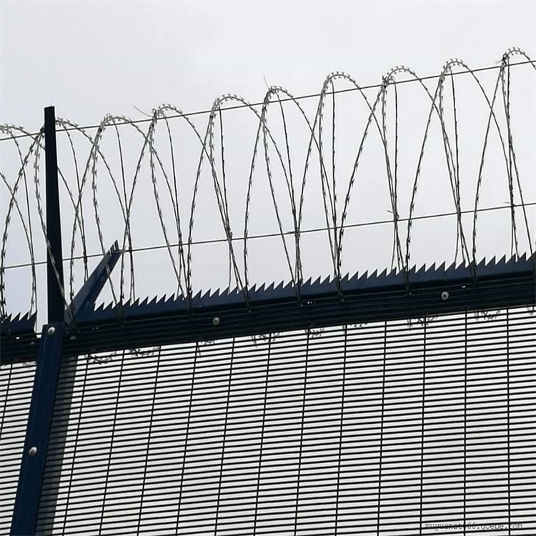 艾瑞監(jiān)獄防逃網(wǎng)焊接的鐵絲網(wǎng)片形成75*150mm的網(wǎng)片至于上下螺旋刀片刺網(wǎng)的中間部分,安裝刀刺網(wǎng)的立柱采用60*60mm方管,壁厚在22.5mm,高2.4米,底部2米圍直線,上部0.4米向內(nèi)折30度成斜線,立柱間隔為3米;長3米為一個單位:立柱表面涂黑綠色(注塑工藝),立柱配有連接件焊接的鐵絲網(wǎng)片和蛇腹網(wǎng)結(jié)合使用,使人望而卻步,擊破人的僥幸心理。
