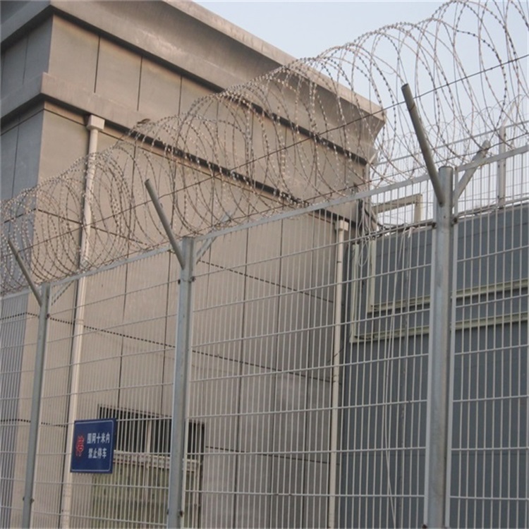 監(jiān)獄刀刺片防護網(wǎng)又稱監(jiān)獄護欄網(wǎng)或監(jiān)獄隔離柵,主要是采用高強度的刀片刺網(wǎng)與普通防護網(wǎng)的結(jié)合,由V型支架立拄,加強型焊接片網(wǎng),安全防盜連接件和刀片刺網(wǎng)組成.刀片刺網(wǎng)是一種新型防護網(wǎng),由銳利尖角鍍鋅鋼板或不銹鋼薄板做刀片,鋼絲做芯線組合而成的防護器材。