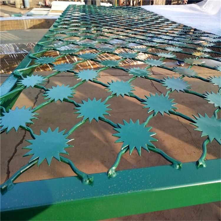 梅花刺網(wǎng)又稱監(jiān)獄護欄網(wǎng)或監(jiān)獄隔離柵,主要是采用高強度的刀片刺網(wǎng)與普通防護網(wǎng)的結(jié)合,由V型支架立拄,加強型焊接片網(wǎng),安全防盜連接件和刀片刺網(wǎng)組成.刀片刺網(wǎng)是一種新型防護網(wǎng),由銳利尖角鍍鋅鋼板或不銹鋼薄板做刀片,鋼絲做芯線組合而成的防護器材