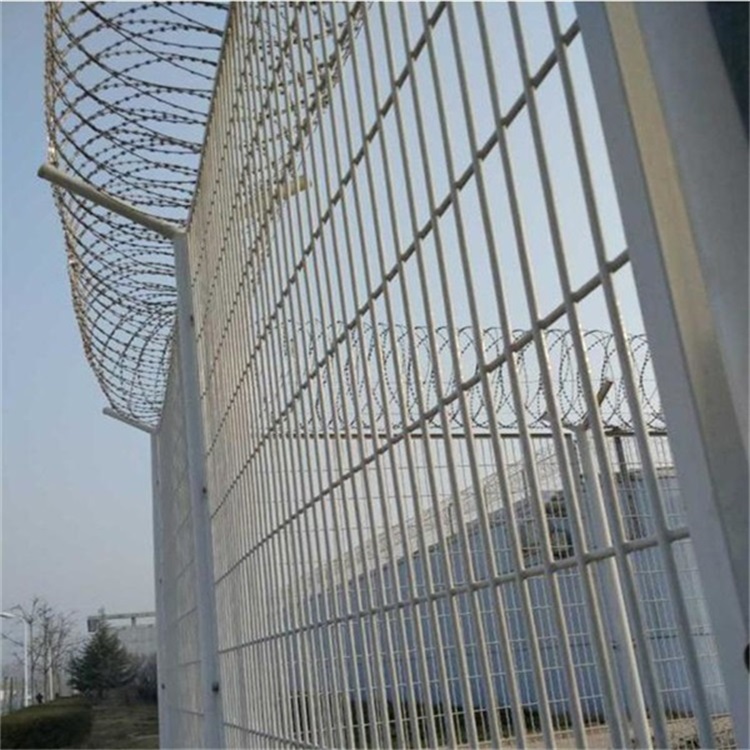 監(jiān)獄安全網(wǎng)圍欄頂部按照要求安裝蛇腹形刀刺網(wǎng),立柱頂部的V型直接兩個側(cè)臂焊接有專用的刺網(wǎng)勾,是每個側(cè)架設(shè)三道熱鍍鋅鋼絲,形成一個V型槽,然后把刀刺網(wǎng)放到上面,再用配套卡扣把鋼絲和刀刺網(wǎng)連接到一起,如果V型架內(nèi)安裝V型網(wǎng)架,安裝就更簡單了,直接把刀刺網(wǎng)連接到V型網(wǎng)上面就可以。