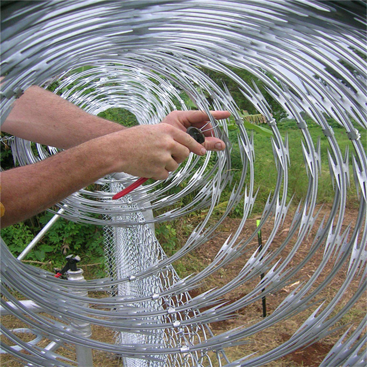 艾瑞廠家生產(chǎn)滾刀網(wǎng)規(guī)格為BTO-22,刀片厚度0.5±0.05,刀長22±1,刀寬15±1(單位:mm),直徑為50cm、60cm、80cm,材質(zhì)為熱鍍鋅,上鋅量120g左右,刺繩拉開后間距在20cm左右。