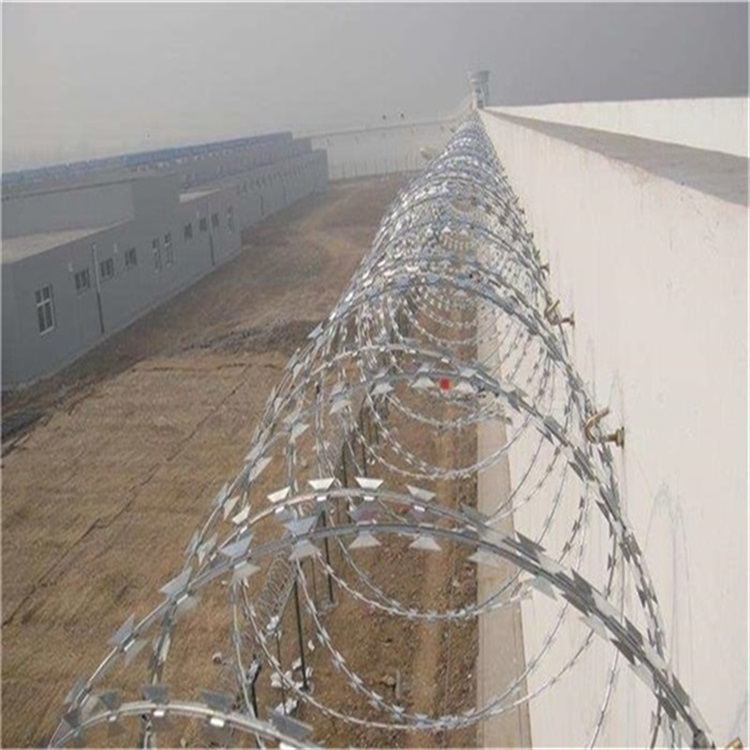 螺旋單一型刀片刺繩是由一根蛇腹型刀片刺繩環(huán)繞而成,不需要使用卡子來(lái)固定,按照其展開(kāi)的自然形式進(jìn)行安裝。刀片刺繩布置的一種,它沿墻壁或柵欄自然環(huán)繞來(lái)達(dá)到防護(hù)目的。選用優(yōu)質(zhì)低碳鋼絲, 鍍鋅、涂塑、噴塑。特點(diǎn)是網(wǎng)身剛硬,不必用張力絲、不需要高技術(shù)工人維護(hù)、易安裝、維護(hù)成本低。