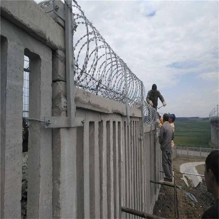 刺絲滾籠的材質(zhì)要求:刺絲滾籠應(yīng)進行熱鍍鋅處理,特殊環(huán)境采用縱向拉筋、冷拔鋼絲、支架、抱箍、連接鋼絲等均需要熱鍍處理,高鐵刺絲滾籠柱帽截面尺寸為180mm×180mm,高度150mm,中心預(yù)留螺栓孔,用于立柱頂部及臺階過度處前后上檻間的連接,拼裝后螺栓孔采用C30混凝土封填。安平縣艾瑞金屬絲網(wǎng)有限公司是專業(yè)生產(chǎn)銷售高鐵金屬防護柵欄的廠家,底價供應(yīng),按需定制款鐵路防護柵欄盡在艾瑞廠家。本廠現(xiàn)有大量鐵路防護柵欄現(xiàn)貨供應(yīng),歡迎廣大客戶來電咨詢訂購。