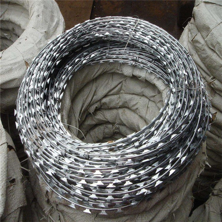刀片刺繩屬于一種優(yōu)質(zhì)的阻絕措施,由不銹鋼板或者鍍鋅鋼板經(jīng)過沖壓刀型和芯線制成,芯線一般是由具有很大張力的鋼絲做成的,原材料的特性造就了刀刺網(wǎng)具有防破壞、防腐蝕等特點。刀刺網(wǎng)具有銳利的刀尖,所以從外觀上來看就給人一種恐怖的感覺。這種獨特的結(jié)構(gòu)賦予了刀刺網(wǎng)良好的防護功能,很多高安全場所、高級住宅區(qū)就是利用了刀刺網(wǎng)良好的防阻效果,將刀刺網(wǎng)普遍地安裝到了外圍墻上,使場地和住宅區(qū)的安全得到了保障。
