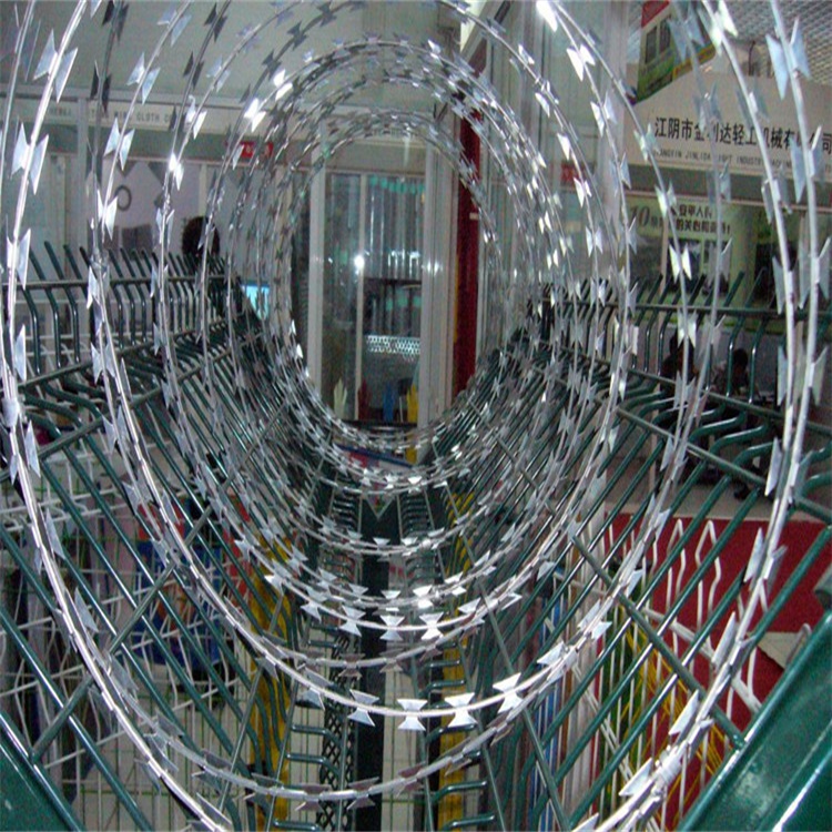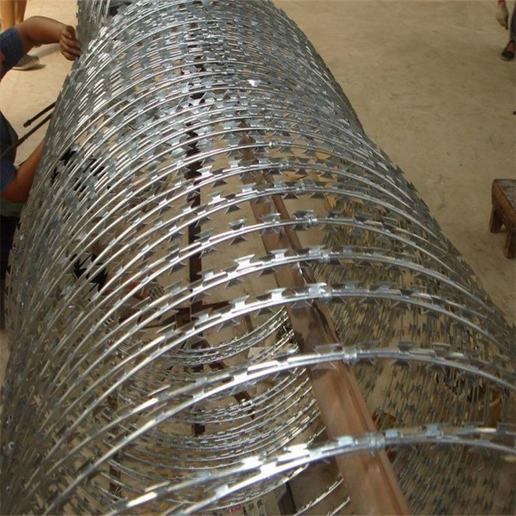 刀片刺繩規(guī)格型號為BTO-22,刀片厚度0.5±0.05,刀長22±1,刀寬15±1(單位:mm),直徑為80cm,材質為熱鍍鋅,上鋅量30g左右,刺繩拉開后間距在20cm左右。